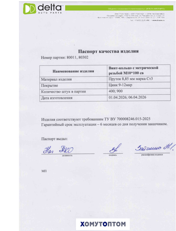 Компания "Oetiker Deutschland GmbH" настоящим подтверждает, что ООО "Дельта Автопартс" г.Москва ИНН 7724011296 является официальным дистрибьютором продукции Oetiker и имеет все необходимые полномочия на предложение и поставку указанной продукции на территории Российской Федерации. Настоящим сертификатом мы распространяем полные гарантии Производителя на продукцию Oetiker, поставляемую через ООО "Дельта Автопартс"